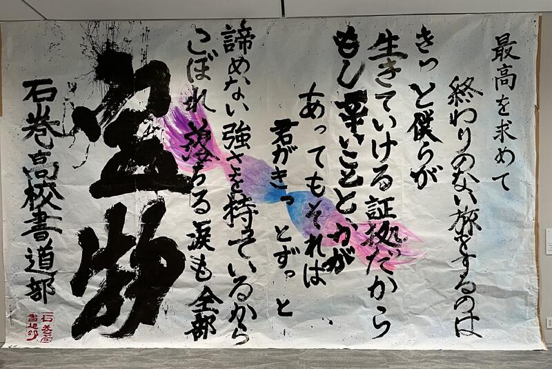 みなさん、こんにちは。石巻高校書道部です!私たちは、顧問の先生、外部講師の先生のご指導のもと、日々の活動に励んでいます。 様々な書道展に向けた個人作品の制作、文化祭や地域のイベントでの書道パフォーマンスの披露が主な活動内容です。 活動時間に決まりはなく、自分のペースで作品制作に取り組めることが、書道部の魅力の一つです。皆さんの入部をお待ちしております。 |